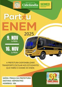Em uma ação de incentivo à educação e de apoio aos estudantes locais, a Prefeitura de Cidelândia anunciou que irá disponibilizar transporte gratuito para os estudantes que realizarão as provas do Exame Nacional do Ensino Médio (ENEM) de 2025. O objetivo é garantir que a logística de deslocamento não seja um obstáculo para os jovens que precisam se deslocar até a cidade vizinha de Imperatriz para prestar o exame.